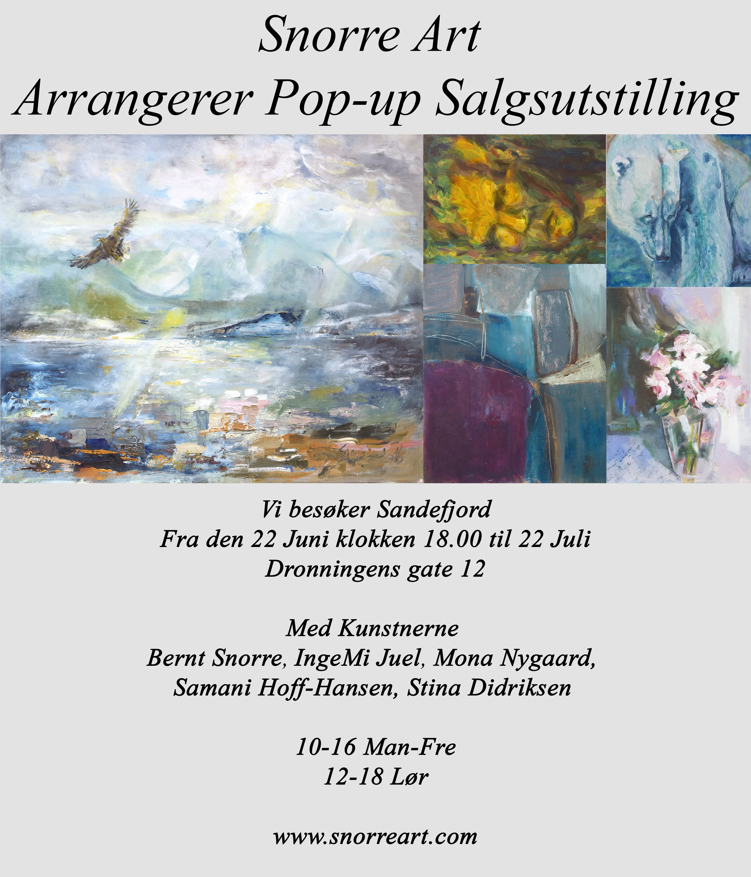 22.juni kl 18 åpnes en stor fellesutstilling i Sandefjord der jeg deltar sammen med Bernt Snorre Johansen, Samani Hoff-Hansen, Stina Didriksen og Mona Nygaard. Her vil både mine oljemalerier og digigraphiene som SnorreArt har trykket for meg utstilles. Disse er håndkolorert og i 10 unike eksemplarer. Vi håper på fulle hus :)